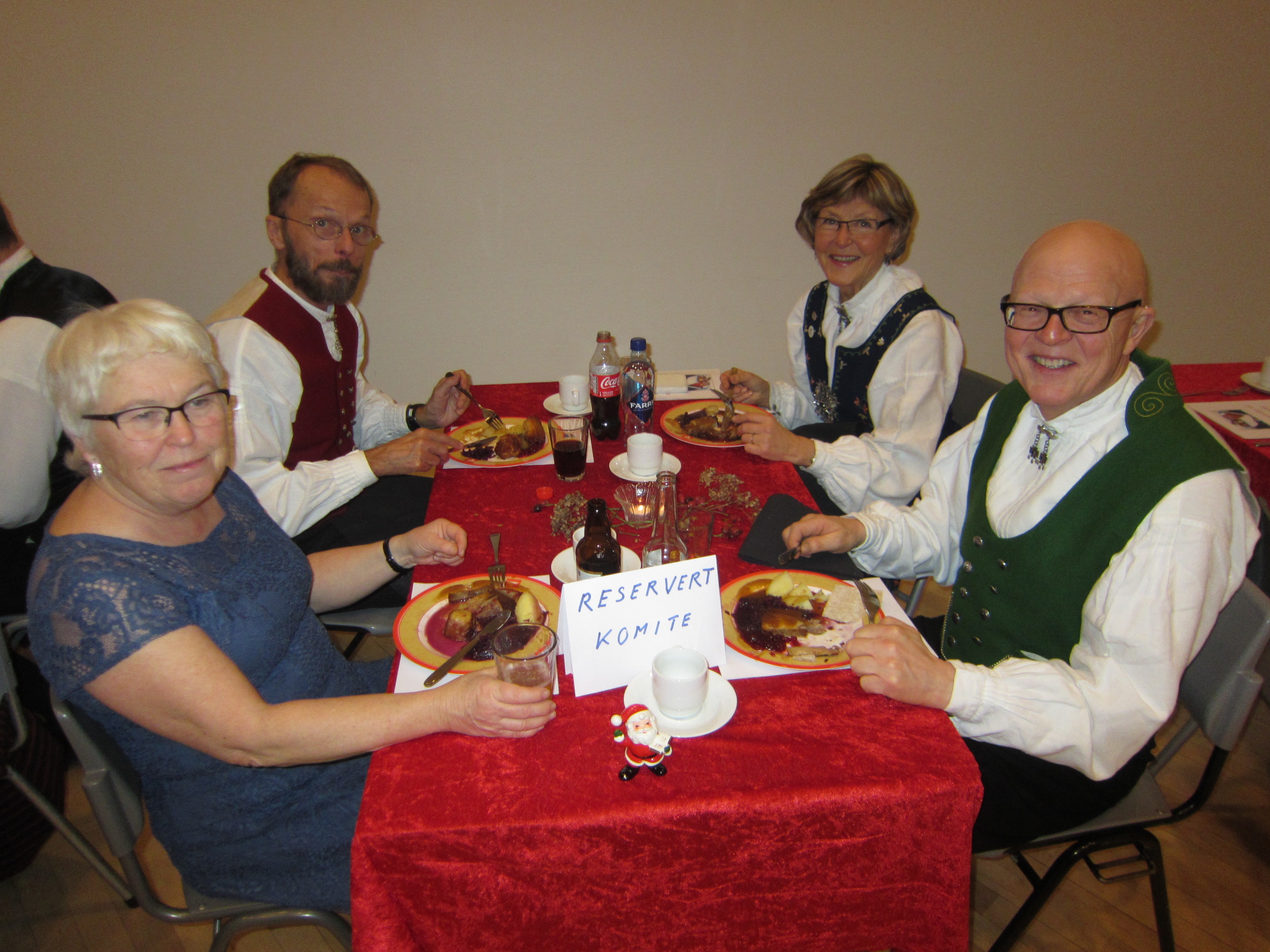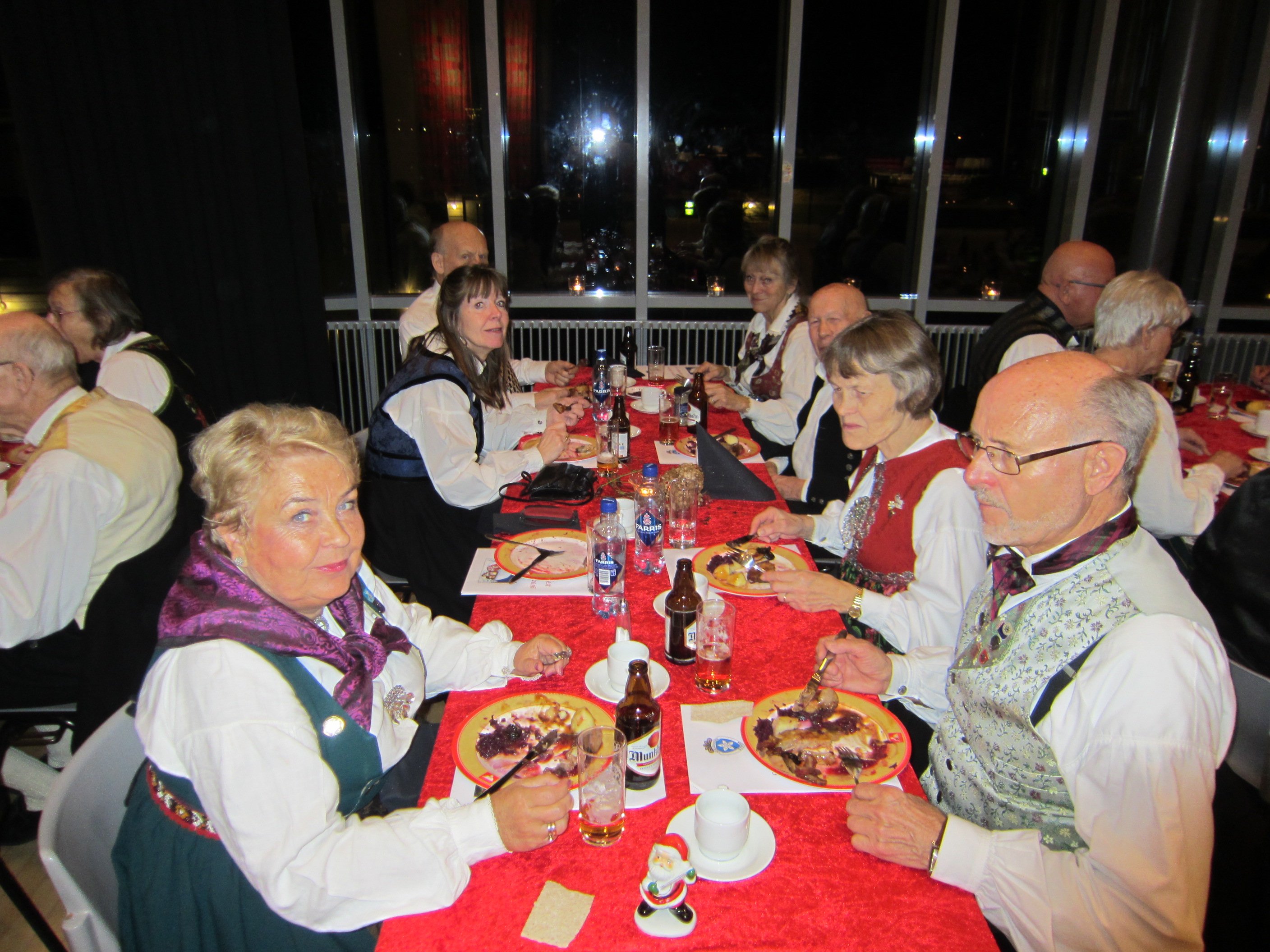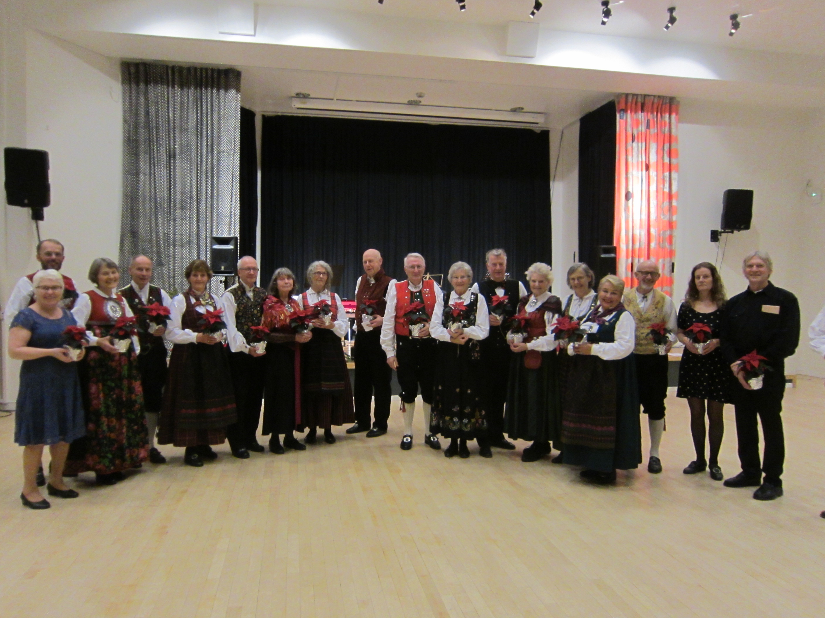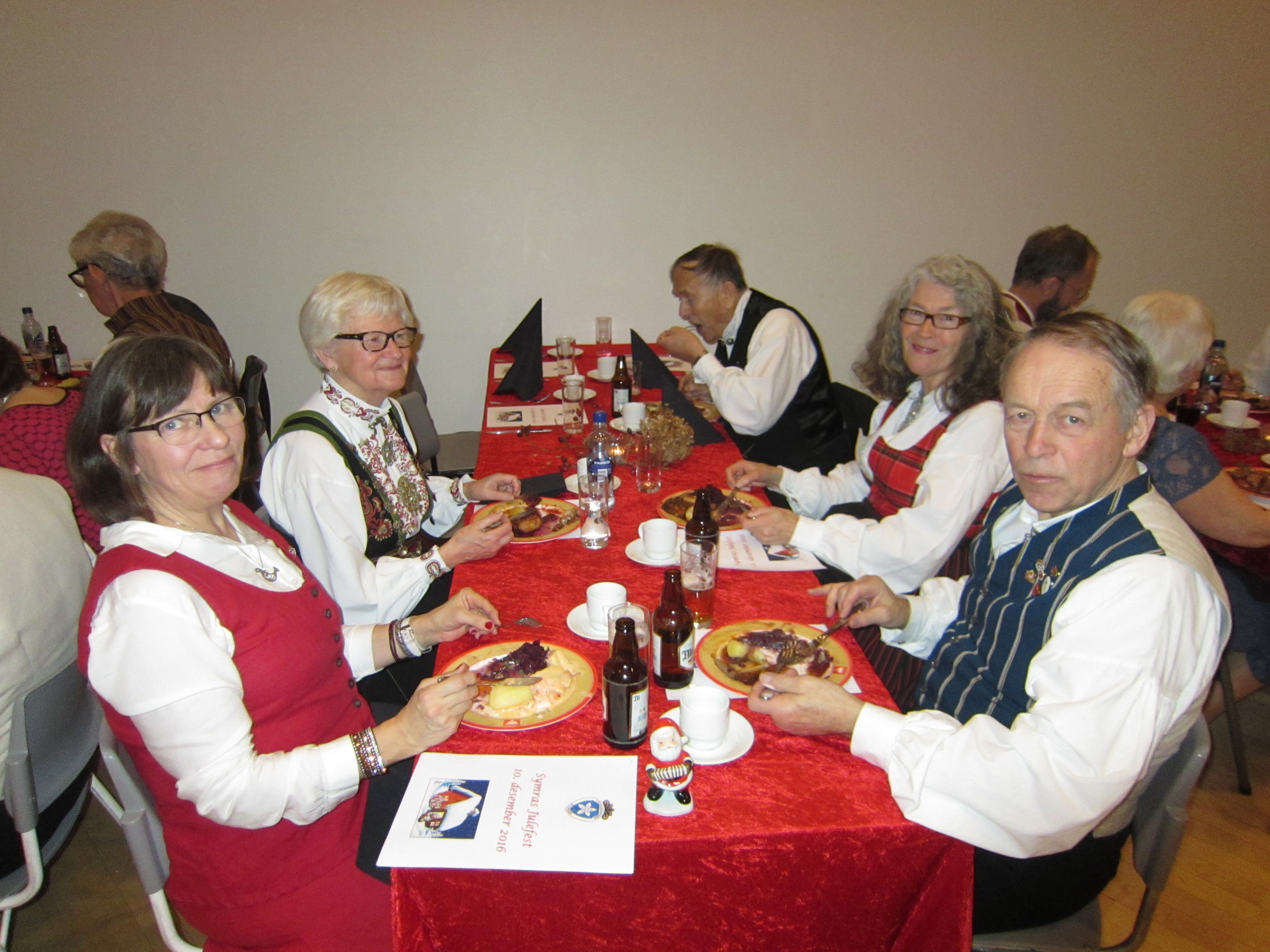 Det var 71 deltakarar på Symra sin tradisjonelle julefest i Engebråten skole. Eit lokale som egnar seg godt til slike festar, med godt dansegolv, og god plass, men ikkje så godt å syngje i. Som vanleg gjorde nemnda ein stor innsats for at alt skulle gå knirkefritt, med servering og den gode julematen og fine festleiinga. Vi må spesielt peike på den framifrå dansemusikken som Solvor styrde med sikker boge. Det 6 manns store orkesteret var heilt topp! Elles fekk som vanleg mange takk og blomar for innsatsen i 2016. Erik helsa frå styret og fortalde litt om planane for neste år. Curre og dei andre 4 frå Stockholm helsa og ynskte oss velkomne til pinse 2017. Inger Frøydis og Vebjørn styrde dansen. Her er nokre bilete frå festen.