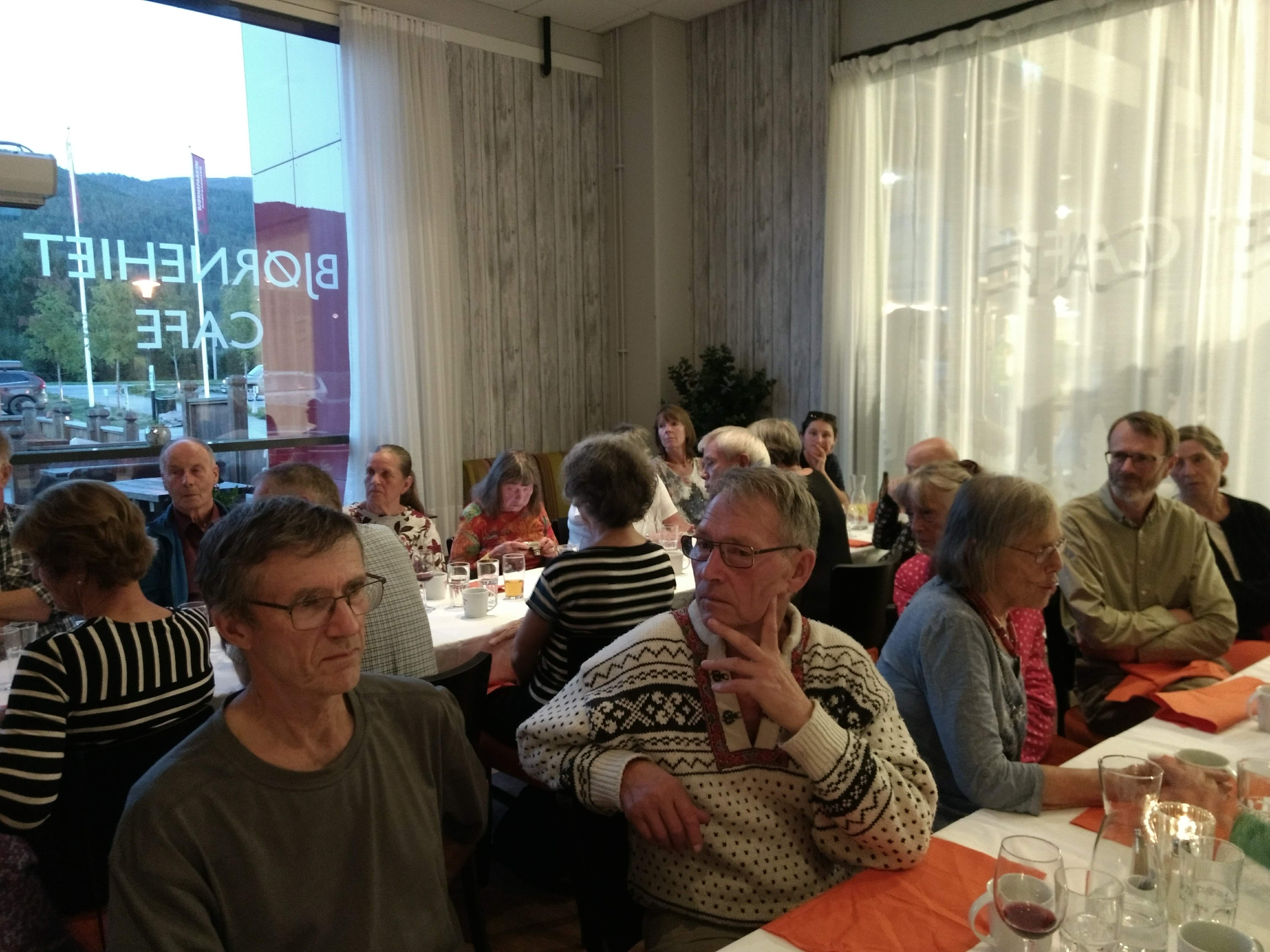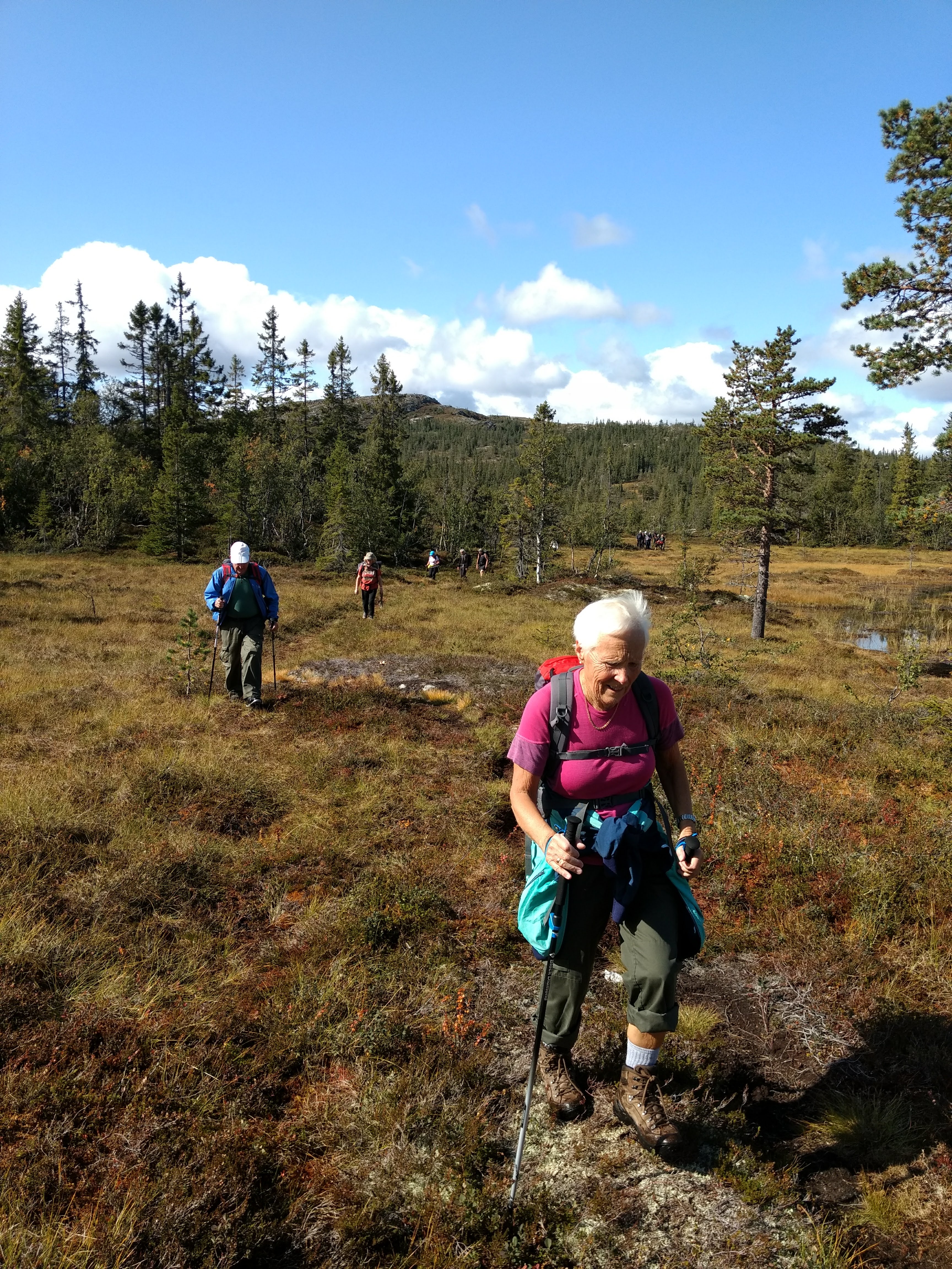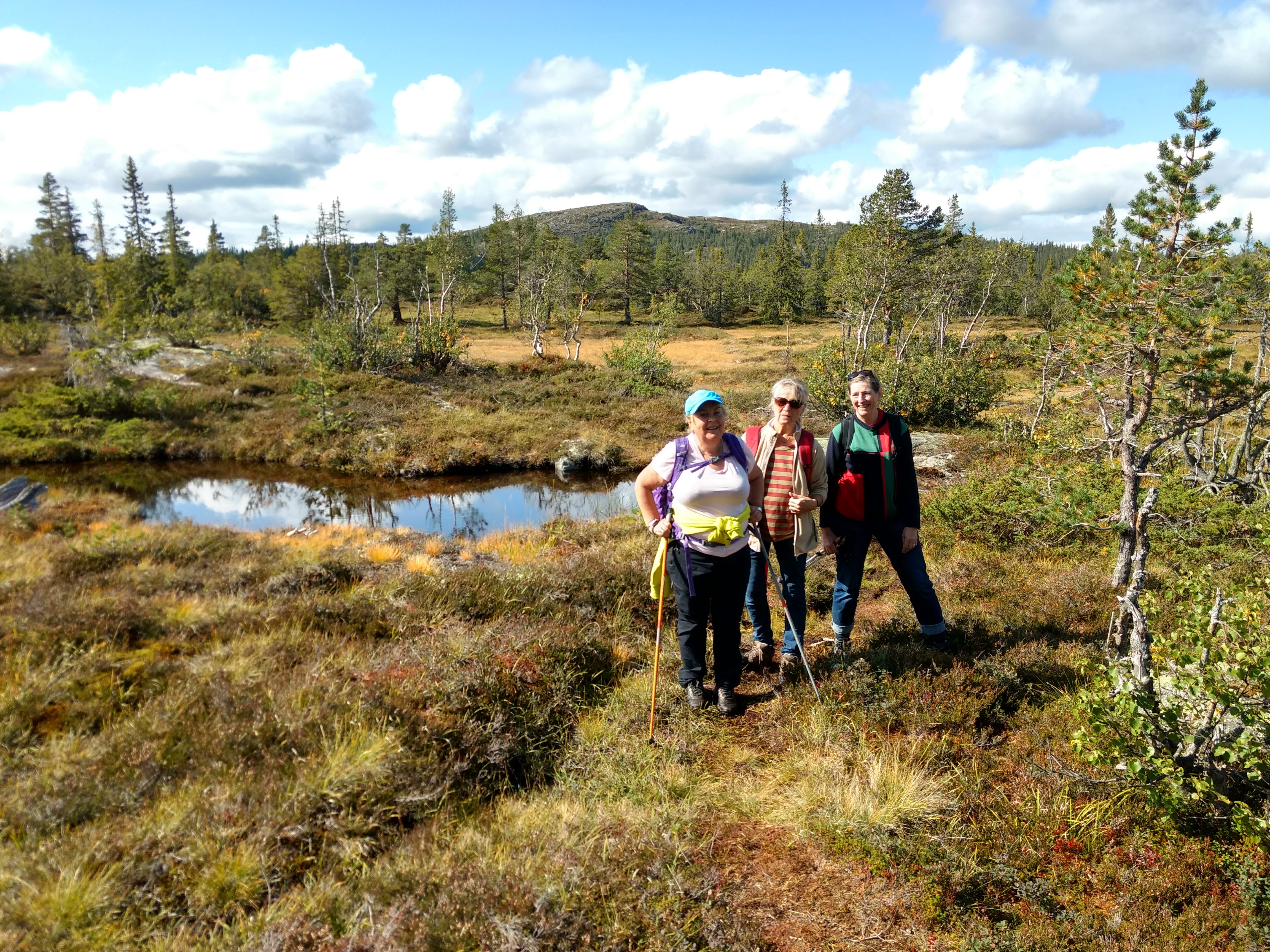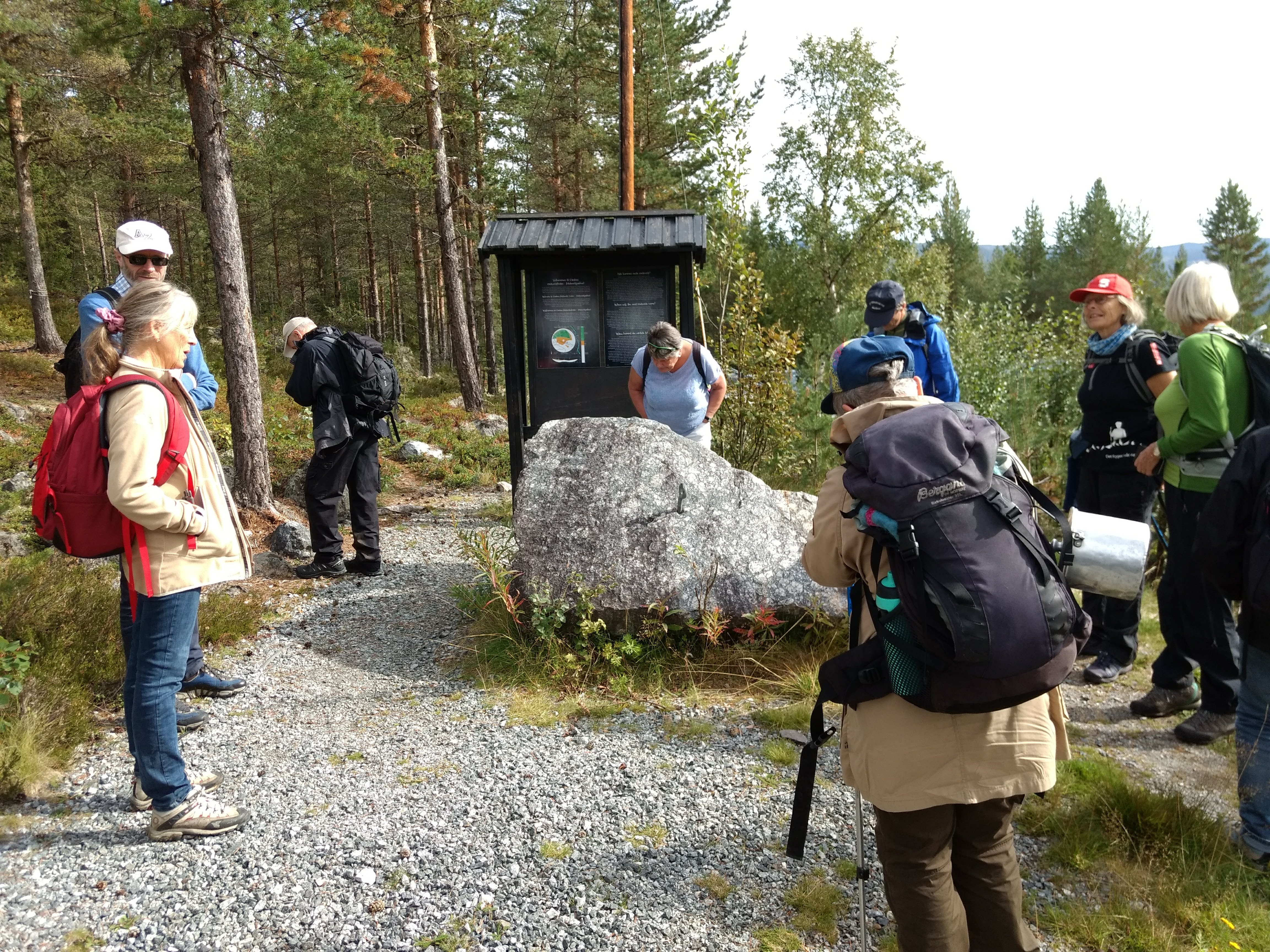 Det var til saman 31 personar som vart med på den fine haustturen til Hallingdal i månadsskiftet august/september 2018. Som vanleg var det Eystein og Oddny som hadde planlagt og gjennomførte turen – som alltid eit spennande opplegg. Vi hadde base på Thon Hotell i Flå – ein grei plass midt i sentrum av bygda som er prega av Thon sine investeringar. Veret var det aller beste alle dagane. Fredag køyrde vi ei mils veg oppå fjellet ved Veneli og tok turen innover Vassfaret. Dei fleste gjekk ein tur på ca ei mil fram og tilbake. Trass i våt sumar, var det mange myrar og små vatn – passa bra med namnet Vassfaret. Laurdag drog vi nokre mil nordover dalen til Garnås der det for lenge sidan var eit stort meteorittnedslag. Eystein fortalde den spennande historia og vi fekk sett restar av dei bergartane som danna seg etter nedslaget. Dei fleste gjekk ei løype på 4 km, og mange plukka tytebær eller blåbær som det var flust av her. Søndag drog vi til Bjørneparken som ligg berre nokre hundre meter frå Flå sentrum. Vi fekk orientering om parken og dyra der, og dei fleste var med på mating av bjørnane, sume også ulvane og andre dyr. Laurdagskvelden fekk vi ei økt med dans i Thon-hallen, så vi hadde plass nok! Fasit: Enno ein fin hausttur i minneboka.